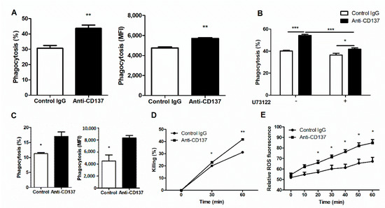 - Nguyen, Q.T.; Nguyen, T.H.; Ju, S.A.; Lee, Y.S.; Han, S.H.; Lee, S.C.; Kwon, B.S.; Yu, R.; Kim, G.Y.; Lee, B.J.; et al. CD137 expressed on neutrophils plays dual roles in antibacterial responses against Gram-positive and Gram-negative bacterial infections. Infect. Immun. 2013, 81, 2168–2177. [Google Scholar] [CrossRef] [PubMed]