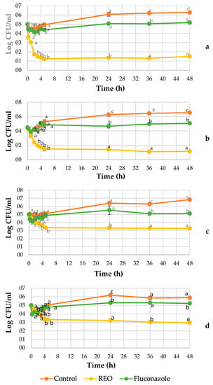Time–kill kinetics for 8.2 µg/mL of REO and fluconazole against Candida tropicalis ORL21 (a), Candida tropicalis ORL20 (b), Candida albicans ORL08 (c), and Candida albicans ORL03 (d) at 37 °C. Results are according to ANOVA test mean values and intervals based on Tukey test for treatments with 95%. Different lowercase letters (a, b, c) indicate significant differences between treatments according to the Tukey test in a confidence interval of 95%.