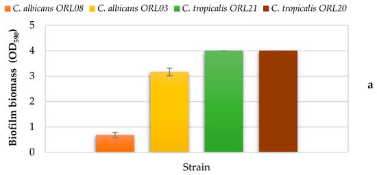 The identification of C. tropicalis ORL20 and ORL21 was successively confirmed using the amplification of the ITS region (ITS1-5, 8S-ITS2) with universal fungal primers (ITS1, ITS4) []. The GenBank accession number of the ITS sequences obtained are C. tropicalis ORL20: KX664640.1 and C. tropicalis ORL21 KX664611.1.
