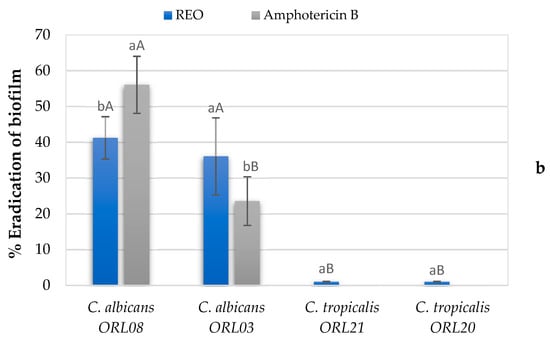 Comparing the REO efficacy with that of amphotericin B, on the biofilm eradication, we observed slight but not significant (p > 0.05) differences between the two treatments. It is worth mentioning that the strongest biofilm formed by C. albicans ORL03 was more difficult to eradicate with both REO and amphotericin B.