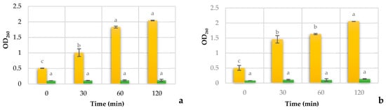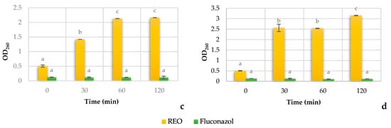 The mechanism of the action of the antifungal activity of essential oils is not clear; some authors suggest that causes significant membrane damage due to the destruction of the membrane integrity []. The effect of REO on Candida membrane degradation and the release of cellular constituents at 0, 30, 60, and 120 min after the treatment were determined, and the results are shown in Figure 3.