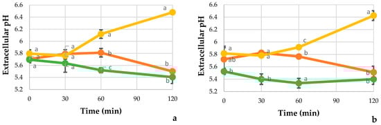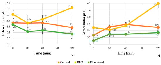 Extracellular pH of Candida yeast treated with REO and fluconazole. C. tropicalis ORL21 (a), C. tropicalis ORL20 (b), C. albicans ORL08 (c), and C. albicans ORL03 (d) with the treatment at different times. Values are the averages of the replicates for all the analyses. Error bars are ± SD of the means. Results are according to ANOVA test mean values and intervals based on Tukey test for treatments with 95%. Different lowercase letters (a, b, c) indicate significant differences between treatments according to the Tukey test in a confidence interval of 95%.