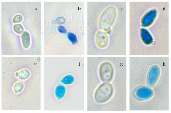 Microscopic observation (100×), of C. tropicalis (ORL21 and ORL20) and C. albicans (ORL08 and ORL3) before and after treatment with REO using Evans blue staining: (a,c,e,g) untreated controls and (b,d,f,h) cells treated with REO (8.2 µg/mL).