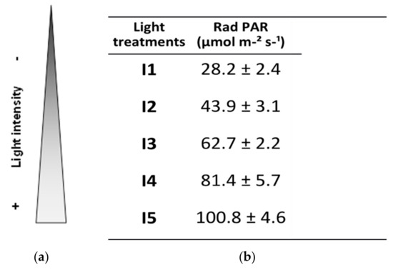 Photosynthetically active radiation (PAR) per light intensity level was determined experimentally as photon photosynthetic flux density (PPFD) with ADC BioScientific Ltd.’s LCi Portable Photosynthesis System (BioScientific Ltd, Hoddesdon, UK). Accordingly, the light intensity treatments are defined in Figure 1.
