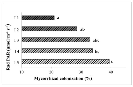 Percentages of root length colonized by the mycorrhizal fungus Rhizoglomus irregulare in inoculated lettuce plants grown for seven weeks under the different light intensities. I1 to I5 correspond to 28, 44, 63, 81, and 101 PARs (µmol m−2s−1), respectively. Data not sharing a letter in common are statistically different according to the LSD test (p < 0.05, n = 6).