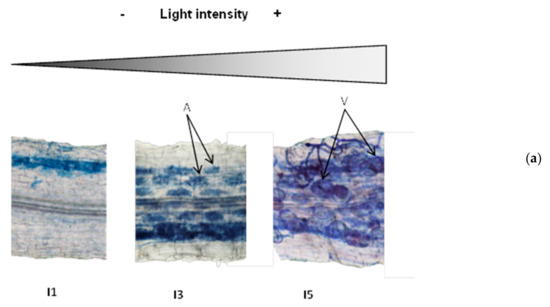 For a more detailed analysis of mycorrhizal colonization, we chose to focus on three levels of light intensity: low (I1), medium (I3), and high (I5), since there were no significant differences between light levels I2, I3 and I4. As shown in Figure 3, changes in light intensity resulted not only in quantitative, but also qualitative differences in mycorrhizal colonization. The intensity of root colonization by the mycorrhizal fungus was limited in the low light intensity I1, but was more spread along the cortex for higher light intensities (I3; I5). This positive correlation between light intensity and colonization intensity was confirmed by a detailed mycorrhizal assessment following the Trouvelot method [66] that evaluates not only presence or absence of the fungus, but how densely colonized the root cortex is (M%, Figure 3B). Remarkably, important differences were also found regarding the fungal structures within the roots. Several fungal structures are present in mycorrhizal roots, including hyphae (intercellular or intracellular), arbuscules, and vesicles. Arbuscules are the most specific structures of this type of symbiosis, where highly branched intracellular fungal hyphae, surrounded by the cell plasma membrane, greatly increase the surface of nutrient exchange between the plant and the associated fungi (Figure 3A, arrows, A). While all areas colonized by the fungus showed arbuscules and vesicles, the fungal reservoir structures (Figure 3A, arrows, V) were almost absent under low light intensities, but their presence strongly increased with light intensity (Figure 3A,B). The proportions of arbuscules within the colonized areas were similar for the different light intensities (around 90%), whereas the presence of vesicles clearly related to the light intensity, ranging from 15% in I1 to up to 80% in I5 (Figure 3B).