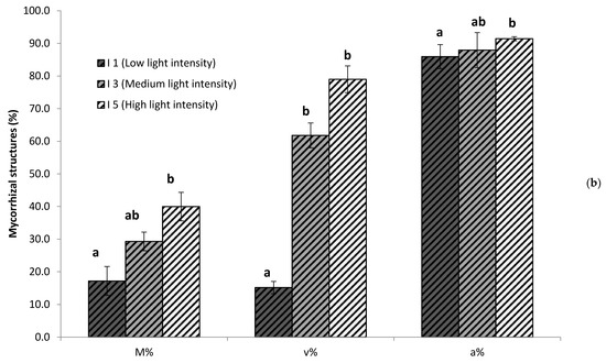 Mycorrhizal colonization and proportions of fungal structures in the root systems of plants grown under different light intensities. (a) Representative pictures of fungal colonization within the roots. Arrows illustrate arbuscules (A) and vesicles (V). (b) Quantification of mycorrhizal colonization intensity of the root system (M%) and abundande of vesicles (v%) and abundance (a%) of within the colonized areas,, determined as described by Trouvelot et al. [66]. Values were determined in plants growing under low (I1, 28 µmol m−2s−1), medium (63 µmol m−2s−1), and high (I5, 101 µmol m−2s−1) light intensity. Data not sharing a letter in common are statistically different according to LSD multiple ranged tests (p < 0.05, n = 6).