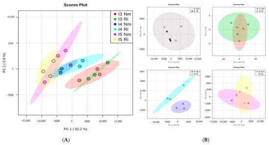 Overview of nutrient organization patterns in lettuce shoots from non-mycorrhizal (Nm) or Rhizoglomus irregulare-colonized plants (Ri) grown under different light intensities. I2 to I5 correspond to 63, 81, and 101 PARs (µmol m−2s−1). (A) Principal component analysis (PCA) of nutrients content at different light intensities (I2, I3, I4, I5). (B) PCA comparing Nm and Ri for each light intensity level.