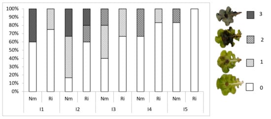 To explore the effects of light and mycorrhizal colonization on lettuce resistance to foliar pathogens, we performed leaf bioassays with the necrotrophic fungal pathogen Botrytis cinerea, the causal agent of grey mold (Table 5). In general, except for I1, the incidence of the disease decreased with light intensity, the percentage of spreading lesions being 67% at I2 and only 17% in I5 for non-mycorrhizal plants. Thus, light intensity impacts basal resistance to Botrytis cinerea. Remarkably, disease incidence was lower in mycorrhizal plants at all light intensities, showing a reduction in disease incidence compared to the Nm plants between 38% at I1 and up to 50% or 100% at the highest intensities (I4 and I5, respectively). Moreover, we evaluated the disease development by scoring disease severity in the leaves according to the disease symptoms scale shown in Figure 5. As for incidence, disease severity was reduced by increasing light intensity, the plants being grown under low light very severely damaged, with approximately 40% of leaves showing the most severe necrosis. Plants grown under high light intensities did not reach the most severe damage levels (Figure 5). As for disease incidence, mycorrhizal colonization also reduced B. cinerea damage at all light intensities. Noteworthily, mycorrhizal plants did not present leaves in the most severe damage categories at any light intensity, and none of the leaves showed disease symptoms at the highest light intensity (Figure 5).
