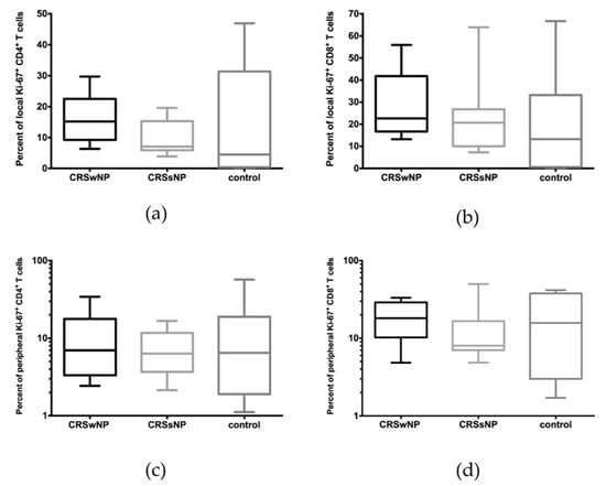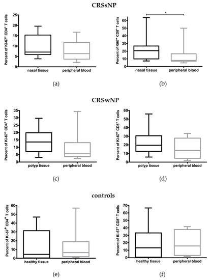 In patients with CRSwNP, no significant differences in the expression of Ki-67 were observed between tissue CD4+ (14.01 ± 8.32% vs. 9.75 ± 10.08%) or CD8+ T cells (23.63 ± 16.02% vs. 15.77 ± 11.57%) and peripheral blood CD4+ and CD8+ T cells, respectively (Figure 1c,d). The same was true for the control group: %Ki-67+/CD4+ T cells (14.52 ± 18.26% tissue vs. 13.99 ± 18.73% blood); %Ki-67+/CD8+ T cells (18.8 ± 23.12% tissue vs. 19.30 ± 17.21% blood) (Figure 1e,f).