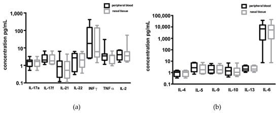 Comparison of cytokine secretion by CD8+ T cells from peripheral blood and inflammatory nasal tissue in CRSsNP patients: high levels of INFγ and IL-6 were found in both groups, but without any significance between both groups regarding (a) Th1/Th17 and (b) Th2 cytokines. T cells were stimulated with a peptide pool of C. albicans for 6 days, and cytokines were measured in the supernatant of the cell culture after 6 days.