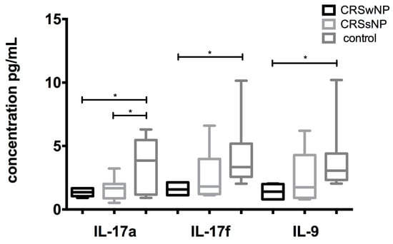 Comparison of IL-17a, IL-17f, and IL-9 secretion between patients with CRSwNP, CRSsNP, and healthy individuals: A significantly higher secretion of IL-17f and IL-9 was found in the supernatant in the local CD8+ T cells from the healthy controls in comparison to the local CD8+ T cells from CRSwNP patients. A higher concentration of IL-17a was found in the healthy controls in comparison to both subtypes of CRS. * p < 0.05.