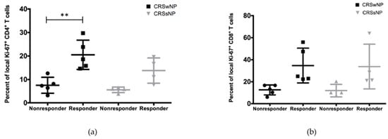 Within the various study groups, a high variability in the expression of the activation marker Ki-67 between tissue samples was seen. Consequently, a subgroup analysis of non-responders and responders was performed for CD4+ (Figure 5A) and CD8+ (Figure 5B) T cells from patients with CRSwNP and CRSsNP. Differences in Ki-67 expression were observed (Figure 5). A significant difference (p = 0.004) between responders (20.50 ± 6.25) and non-responders (7.52 ± 3.41) was measured in CD4+ T cells from CRSwNP patients.