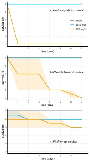 Survival of aquatic invertebrates ((a) Asellus aquaticus, (b) Planorbella duryi and (c) Pisidium sp.) after exposure to Wofasteril40 concentrations of 2913 mg/L (blue) and 291.3 mg/L (orange). Shaded areas indicate uncertainties about survival due to inactivity of the respective mollusk species.