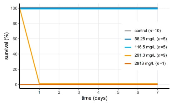 Most of the aquatic invertebrates were tolerant to Wofasteril40 at concentrations of 291.3 mg/L (14/15 or 93% survival; 23.3–101.9 mg/L hydrogen peroxide, 72.8–116.5 mg/L PAA and 72.8–189.3 mg/L acetic acid), but not at 2913 mg/L (3/15, or 20% survival; see Figure 1a–c; 233.0–1019.4 mg/L hydrogen peroxide, 728.1–1165.0 mg/L PAA and 728.1–1893.1 mg/L acetic acid). Invertebrate survival differed significantly between low and high PAA concentration treatment groups (Fisher’s Exact test for Count data; p = 1.157 × 10−4). For the D. pictus tadpoles, Wofasteril40 was acutely toxic at high concentrations (Figure 2), but not at low concentrations. Survival differed significantly (Fisher’s Exact Test for Count data; p = 1.083 × 10−5) between groups exposed to concentrations of 116.5 mg/L (9.32–65.0 mg/L hydrogen peroxide, 29.1–46.6 mg/L PAA and 29.1–75.7 mg/L acetic acid) or lower (n = 10, mortality: 0%) and of 291.3 mg/L and higher (n = 10, mortality = 100%). Only one tadpole was tested at 2913 mg/L. This concentration was acutely toxic. The four other tadpoles from this treatment group were reassigned to the group exposed to 291.3 mg/L.