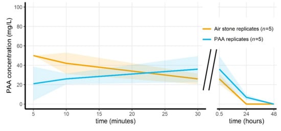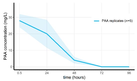 Mean measured PAA concentration through time in the PAA-treated replicates of the pilot microcosm experiment. Shaded areas indicate the mean ± standard deviations.