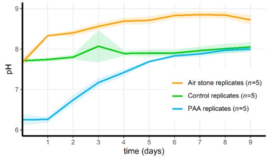 pH changes over time for the PAA-treated microcosms with air stones and PAA treatment (orange), the control microcosms (green) and the PAA-treated microcosms without air stones (blue) during the second microcosm exposure experiment. Shaded areas indicate mean ± standard deviation.
