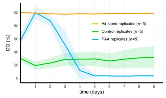 Mean dissolved oxygen (%) through time during the third microcosm exposure experiment. All microcosms were aerated and treated with PAA. Shaded areas indicate mean ± standard deviation. Notice the scale difference on the y-axis compared to Figure 6.