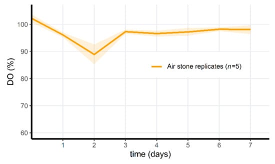 In a second microcosm experiment, we hypothesized that the mortality observed in this first experiment was initiated by a dramatic drop of dissolved oxygen (DO) concentrations (as seen in Figure 6). Initially, DO increased in the PAA microcosms compared to the control, but in the non-aerated replicates, the oxygen levels dropped quickly after the degradation of PAA. PAA differed significantly through time in this treatment group (Friedman test, p = 1.80 × 10−5). In the aerated PAA-treated group and the control group, oxygen parameters remained relatively stable, although the standard deviation of the control groups increased through time. Whereas the invertebrates in the non-aerated PAA treatment group died on the 6th day (A. aquaticus, n = 5) or appeared lethargic (Radix sp., n = 10), all of the animals in the aerated PAA-treated microcosms survived. In one control replicate, one A. aquaticus had also died on the 6th day. The dissolved oxygen in this particular control microcosm was never above 25%, and on the 7th day, reached a minimum of 7.3% (0.72 mg/L). In all other control microcosms, all animals survived, and oxygen levels were above 15% at all times. Survival did not differ between the three groups for Radix sp. (100%). Survival differed significantly for A. aquaticus between all groups (Fisher’s Exact 2 × 3 Test for Counting data; p = 5.994 × 10−3). Post hoc pairwise comparisons indicated a significant difference between the treated groups with and without aeration (Fisher’s Exact Test for Counting data; p = 7.937 × 10−3) but not between the control group and treated group without air stones (Fisher’s Exact Test for Counting data; p = 0.04762 (>0.017, Bonferroni-corrected p-value)) and between the aerated treatment group and the control group (Fisher’s Exact Test for Counting data; p = 1). The third microcosm setup served as a proof of concept. Tadpoles were introduced 48 h after PAA treatment, and all (n = 50) survived for 5 days in the aerated microcosms. A minor (approximately 10%) DO drop could be observed 2 days after application (Figure 7), as opposed to stable DO observations in the aerated treatment of the second microcosm experiment. On the 3rd day, DO had increased again and afterwards, oxygen concentrations remained stable.