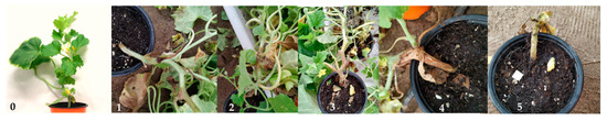 To prepare P. aphanidermatum inocula the procedure described by Marin et al. [58] was followed. Inocula of the other phytopathogens were prepared by scraping and subsequent filtration as previously described, apart from R. solani, S. sclerotiorum and P. xanthii. Phytopathogens were inoculated when the plants showed a second true leaf, and using a sterile micropipette, inoculation was performed by uniformly applying the zoospores/conidia suspension (5 mL) at a concentration of 104 CFU·mL−1 uniformly to the peat surface. In the case of B. cinerea and M. melonis, the pathogen was applied by spraying the plant five times at the same concentration (6 mL). Before this, the first true leaf had been cut to facilitate pathogen entry. Inoculation with R. solani was carried out by mixing mycelium into the substrate; inoculation with S. sclerotiorum was performed using the spray mycelium method as described by Chen and Wang [59]. The stem was wounded to facilitate pathogen entry. Symptom severity was recorded continuously, and 30–60 days after inoculation, a final disease severity index was estimated according to the following scale: 0 = healthy plant; 1 = initial symptoms; 2 = moderate symptoms (25%); 3 = affected plant (50%); 4 = severely affected plant (75%); and 5 = dead plant (Figure 1).