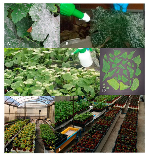 Figure 2. (A). Zucchini leaves with symptoms of powdery mildew caused by P. xanthii. (B). Application of sterile water for rinsing off spores. (C). Spraying of spores on healthy seedlings previously treated with P. variotii (PAE) or water (T0). (D). Arrangement of leaves to determine the affected leaf area. (E,F). Distribution of seedlings during the different assays.