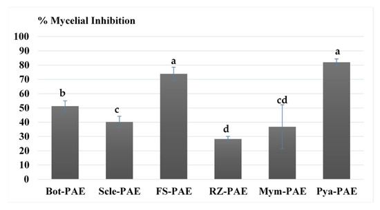 Figure 3. Antagonistic effects of Paecilomyces variotii (PAE) on Botrytis cinerea (Bot), Sclerotinia sclerotiorum (Scle), Fusarium solani (FS), Pythium aphanidermatum (Pya), Rhizoctonia solani (Rz), and Mycosphaerella melonis (Mym) in dual culture on PDA medium. Percent mycelial inhibition was calculated as PIRM = ((R1 − R2)/R1) × 100, where PIRM is the percentage of inhibition of radial mycelia growth of the pathogen. R1 is radial growth of the pathogen in control plates, and R2 is radial growth of the pathogen in dual cultures. Means with the same letter are not significantly different (least significant difference test) according to an analysis of variance (p > 0.05).