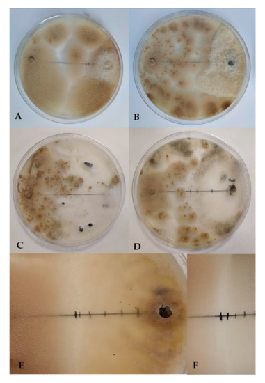 Figure 4. In vitro antagonistic effects of P. variotii on F. solani (A), M. melonis (B), S. sclerotiorum (C), and B. cinerea (D) in 9 cm Petri dishes. Inhibition zone between P. variotii and the phytopathogens M. melonis (E) and F. solani (F) (Images 75% increased).
