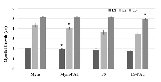 Figure 6. Effect of volatile metabolites of P. variotii on mycelial growth of M. melonis and F. solani. L1, L2, and L3: measurements performed every two days. Data were analysed using Student’s t-test. Means with * denote significant difference between both treatments according a pairwise comparison using Student’s t-test (p < 0.05).