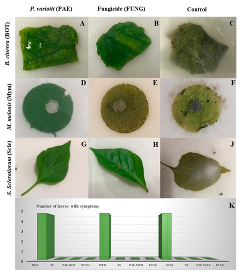 Figure 7. Visual symptoms of B. cinerea (AC), M. melonis (DF), and S. sclerotiorum (G,H,J) infection on detached leaves treated with P. variotii (A,D,G) or fungicide (B,E,H). Control (C,F,J): visual symptoms without P. variotii or fungicide. (K). Number of leaves with symptoms in each treatment.