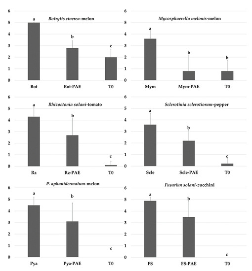 Figure 8. Disease severity of phytopathogens in plants was assessed 30–60 days after inoculation based on a scale from 0 to 5, where 0 indicates no visible disease symptoms and 5 indicates a dead plant. Bars indicate mean standard deviations (24 plants/repetition). Means with the same letter are not significantly different (least significant differences) according to an analysis of variance.