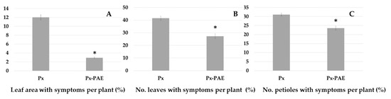 Figure 9. Control of P. xanthii by spraying zucchini plants with P. variotii. (A). Mean proportion of leaf area with powdery mildew symptoms per plant. (B). Percentage of the number of leaves with symptoms per plant. (C). Percentage of number of petioles with powdery mildew. Px: Application of P. xanthii. Px-PAE: Application of P. variotii three days before application of P. xanthii. Means with * denote significant difference between both treatments according a pairwise comparison using Student’s t-test (p < 0.05).