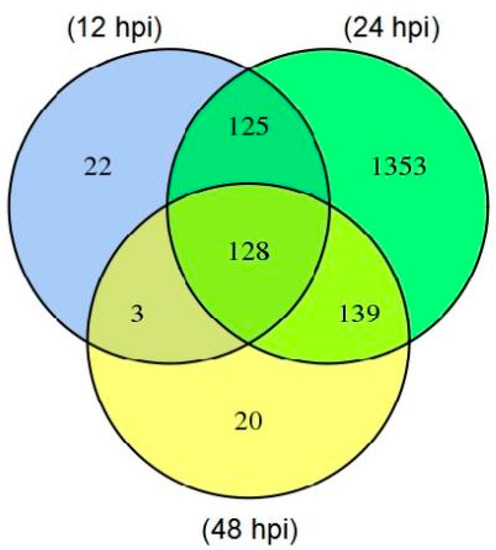 Figure 1. Differentially expressed genes (DEGs) at three time points after F. graminearum inoculation. The number of DEGs were calculated by comparison of samples at 12, 24 and 48 hpi versus the control F. graminearum.