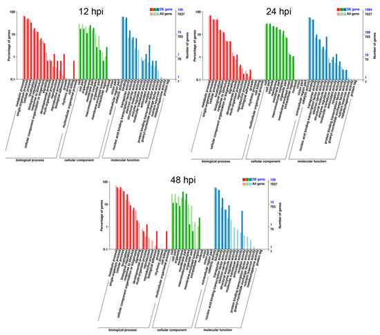 After mapping genes of all samples with the F. graminearum reference genome from GenBank, genes from F. graminearum vs. samples at 12 hpi (T04_T05_T06), 24 hpi (T07_T09) and 48 hpi (T10_T11_T12) were defined as the differentially expressed genes (DEGs). A total of 2313 DEGs were annotated based on different functional databases, of which 278, 1745 and 290 genes were differentially expressed at 12, 24 and 48 hpi, respectively. DEGs were most frequently identified at 24 hpi while they were almost equal in numbers at 12 and 48 hpi. In addition, we found that 128 DEGs were commonly expressed at three indicated time points, but 22, 1353 and 20 DEGs were specifically expressed at 12, 24 and 48 h after F. graminearum inoculation, respectively (Figure 1). Furthermore, there were more down-regulated DEGs (1156/2313) than up-regulated ones (589/2313), and the maximum up- or down-regulated DEGs were appeared at 24 hpi (Figure 2).