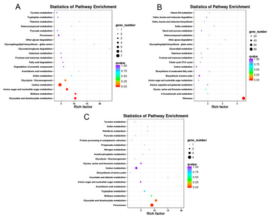 For KEGG enrichment analysis, 27, 343 and 30 of DEGs from the total 1923 annotated genes were classified into 30, 92 and 19 KEGG pathways at 12, 24 and 48 hpi, respectively. The top 19 KEGG pathways at three time points were depicted as shown in Figure 4. The most KEGG pathways were annotated at 24 hpi (Table S3) and enriched into ribosome (84 DEGs), biosynthesis of amino acids (32 DEGs), carbon metabolism (24 DEGs), glycine, serine and threonine metabolism (16 DEGs) and other pathways involving in metabolic, genetic information processing and cellular process of F. graminearum (Figure 4B). Similarly, carbon metabolism and glyoxylate and dicarboxylate metabolism, peroxisome had relatively higher enrichment than other KEGG pathways at 12 and 48 hpi, respectively (Figure 4A,C).