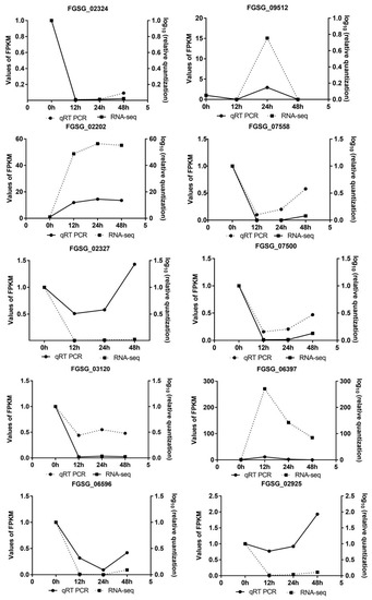 In order to validate the gene expression data obtained from RNA-seq analysis, 10 genes of F. graminearum were randomly selected for qRT-PCR verification, and these genes were listed as FGSG_02324, FGSG_09512, FGSG_02202, FGSG_07558, FGSG_07500, FGSG_02327, FGSG_03120, FGSG_06397, FGSG_06596, FGSG_02925, involved in transport and catabolism, secondary metabolites biosynthesis, lipid transport and metabolism, amino acid transport and metabolism and some functionally unknown. The gene expressions were normalized by the 2−ΔΔCt method using the housekeeping gene EF1-α of the Fusarium genus, and results showed that these selected genes have showed significant difference in relative quantity from RNA-seq analysis but had almost the same expression pattern in Figure 5.