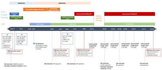 Unfortunately, the patient missed doses of both ART and isavuconazole in January 2021 whilst at home due to COVID-19 lockdown isolation, which was reflected in bloods on day 119 post initial diagnosis; HIV VL 11,875 copies/mL and isavuconazole level 1.68 mg/L. The patient was reloaded with isavuconazole and recommenced ART with close follow up and therapeutic drug monitoring. A new M184V mutation was found on HIV genotypic resistance testing at that time. The patient is currently in week 15 of therapy with isavuconazole and doing well with a view to stopping therapy per guidelines [2].