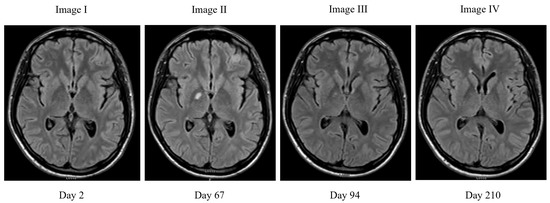 MRI FLAIR changes over time. Image I on admission shows no masses, Image II shows 11 mm enhancing masse in right corpus callosum and left frontal meningioma, Image III shows improvement in the right corpus callosum mass to 4 mm, Image IV shows complete resolution of the mass.