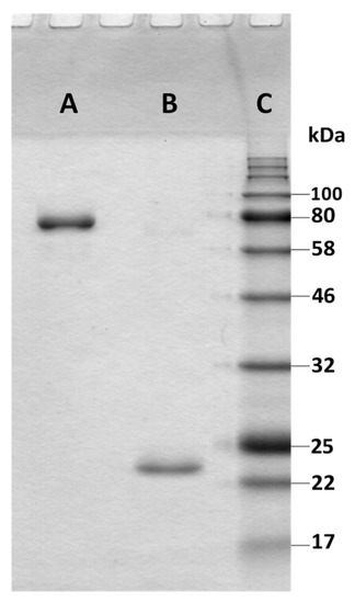 SDS-PAGE of the purified B. spectabilis ATHUM 8891 hemicellulases. (A) PvXyd3A, (B) PvXyn11A, (C) Protein marker NEB (#P7712).