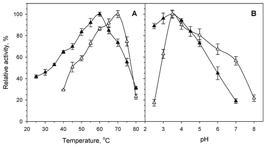 Effect of temperature ((A) determined at pH 4) and pH ((B) determined at 50 °C) on the activity of the purified PvXyn11A (▲) and PvXyd3A (△) of B. spectabilis ATHUM 8891.