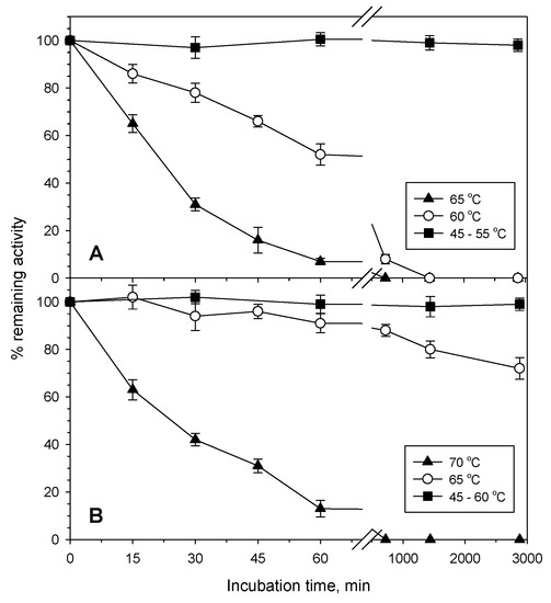 In accordance with the thermophilic nature of the genus Byssochlamys, PvXyn11A and PvXyd3A revealed thermophilic characteristics. PvXyn11A had a temperature optimum at 60 °C, exhibiting over 70% of its maximum activity within a temperature range between 45 °C and 70 °C (Figure 2A). PvXyn11A also appeared very stable up to 55 °C, where it retained its initial activity for at least 24 h of incubation. At 60 °C and 65 °C, PvXyn11A retained 50% of its initial activity upon 45 min and 20 min of incubation, respectively (Figure 3A). Regarding PvXyd3A, the temperature optimum was even higher, at 70 °C. Beyond this temperature, though, activity dropped rapidly, probably due to the instability of the enzyme at these temperatures. PvXyd3A revealed higher thermostability compared to the xylanase as it retained its initial stability for at least 24 h at 60 °C. At 70 °C, though, the activity of PvXyd3A decreased to the 50% of the initial from the first 20 min of incubation (Figure 3B).