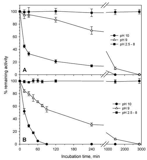 Both enzymes revealed a preference for acidic environments. PvXyn11A exhibited its highest activity at pH 3.5. The activity of PvXyn11A dropped gradually at higher pH values, while in values as low as 2.5, the activity remained at approximately 90% of the optimum (Figure 2B). The enzyme was stable upon incubation within a broad pH range from 2.5 to 8, retaining 100% of its activity for at least 48 h (Figure 4). Similarly, PvXyd3A had an optimum pH at 3.5, while it retained more than 50% of its optimum activity within the pH range 3 to 7 (Figure 2B). Similar to the xylanase, the activity of PvXyd3A was not affected by the prolonged incubation in buffers with pH from 2.5 to 8 (Figure 4).