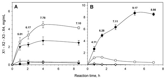 Hydrolysis of beechwood xylan (initial concentration of 25 g/L) by only the xylanase PvXyn11A (25 nkat/mL—(A)) and a mixture of PvXyn11A and PvXyd3A (25 nkat/m–2.5 nkat/mL—(B)) at pH 4 and 50 °C. ●, xylose (X1); ○, xylobiose (X2); ▼, xylotriose (X3); ∆, xylotetraose (X4). Numbers at each time point indicate the sum of X1 to X4 (mg/mL). Data are the means of triplicate reactions with standard deviations.
