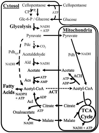 Overview of fungal acetyl-CoA metabolism. Common acetyl-CoA pathways in fungi are shown in solid arrows. A cytosolic pyruvate dehydrogenase (heavy dashed line) may increase functionalized hydrocarbon production but was not found in fungi and was not annotated in Ascocoryne sarcoides NRRL 50072. Enzyme abbreviations: ACH—acetyl-CoA hydrolase, Acl—ATP citrate lyase, Acs—acetyl-CoA synthetase, ACT—acylcarnitine transport, Ald—aldehyde dehydrogenase, CP—cellobiose phosphorylase, Pdhcyt—pyruvate dehydrogenase, Pdhcyt—cytosolic pyruvate dehydrogenase, Pdc—pyruvate decarboxylase.