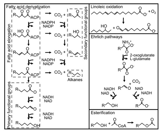 Overview of functionalized hydrocarbon producing pathways relevant to A. sarcoides NRRL 50072. Three pathways are depicted: fatty acid derivatization, linoleic oxidation, and Ehrlich pathways [3,14,15,43]. Products from these pathways and their esters account for most observed FHs. ACP refers to the acyl carrier protein associated with fatty acid synthesis, while R refers to carbon backbones. Associated genetic annotations can be found in the Supplementary Materials.
