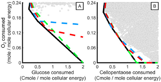 Metabolic strategies for cellular energy production from glucose (A) and cellopentaose (B) that minimize resource utilization span between complete oxidation and fermentation. Overall optimal O2 and carbon source utilization strategies for cellular energy production are highlighted with black boundaries. All possible metabolic strategies (elementary flux modes) are grey points. Metabolic strategies that produce only acetate (blue dashed line), acetaldehyde (red dashed line), or ethanol (green dashed line) are highlighted.