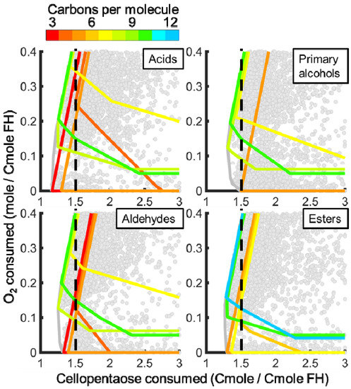 Ecologically competitive phenotypes for cellular energy production were identified using resource allocation theory, postulating that the fittest cellular phenotypes minimize the amount of limiting resource required to make a product [45]. The theory was applied by calculating the carbon source and O2 required to produce cellular energy for each elementary flux mode (EFM) as defined by the Cmoles of carbon source and moles of O2, respectively, consumed to produce a mole of cellular energy (equal to one mole of ATP phosphodiester bonds). EFMs that minimized carbon and O2 required to produce cellular energy formed a trade-off surface (black line in Figure 3). EFMs that minimized the carbon required to produce cellular energy are to the left in the plot. The least carbon required to produce energy was achieved by metabolic strategies that completely oxidized cellulose to carbon dioxide and water and required 0.2 Cmoles of cellopentaose and 0.2 moles of O2 per mole of cellular energy. Under O2 limited conditions, phenotypes that secrete reduced carbon byproducts, such as acetate, acetaldehyde, and ultimately ethanol, became competitive (i.e., moving from the top left to the bottom right of the trade-off surface in Figure 3). Anoxic cellular energy production was predicted (1.3 Cmole cellopentaose per mole of cellular energy), but not anoxic growth due to an O2 requirement to produce sterols and other lipids (Supplementary Materials). A Cmole of cellopentaose produced more cellular energy than a Cmole of glucose due to the modeled sugar transporters. Transport of one cellopentaose (i.e., five monomers of glucose) or one glucose into the cell required the same energy expenditure.