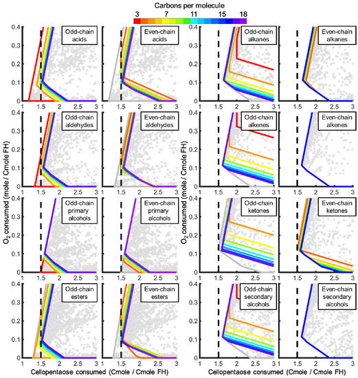 FH production balances cellular energy production, electron trafficking, and resource utilization, which are all sensitive to nutrient limitations during cultivation. Trade-offs between carbon source and O2 requirements quantified competitive FH producing phenotypes. The carbon and O2 requirements to produce FHs were defined as the Cmoles of carbon source or moles of O2, respectively, consumed to make a Cmole of FH. Eight hydrocarbon functional groups (i.e., acids, esters, aldehydes, ketones, primary and secondary alcohols, alkanes, and alkenes) with chain lengths from C3 to C20 were modeled that represent most FHs reported for A. sarcoides (Table 2). FH producing metabolic strategies that required the least carbon source and O2 are to the left and bottom, respectively (Figure 4 and Figure 5). Metabolic strategies that produced a single, target FH of a specific chain length while minimizing carbon and O2 requirements are depicted by colored lines in Figure 4 and Figure 5. FHs generally required less carbon source to produce in the presence of O2 as quantified by the lowest Cmole of substrate per Cmole of FH (i.e., negative slopes of colored lines in Figure 4 and Figure 5). Production of Ehrlich pathway derivatives generally required fewer Cmoles of carbon source than fatty acid derivatives. The low molecular weight primary fermentation products formate, acetate, acetaldehyde, and ethanol were not considered as they were not the focus of this study.