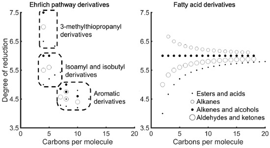 Resource requirements to produce Ehrlich pathway derivatives from 7 amino acids (i.e., methionine, valine, isoleucine, leucine, phenylalanine, tryptophan, and tyrosine) were governed under oxic conditions by the FH degree of reduction. Aromatic Ehrlich pathway derivatives, such as indole-3-acetate and 4-hydroxyphenylacetate, required the least carbon source of any considered FHs under oxic conditions (green lines in Figure 4), only propanoic acid required less under anoxic conditions (red line in Figure 4). These FHs retained a large fraction of the carbon from the carbon source and have moderate degrees of reduction that clustered around 4.5 (Figure 6). Conversely, Ehrlich pathway derivatives with higher degrees of reduction (i.e., 5–6 electron moles Cmole−1), such as isopentyl derivatives, retained less carbon source carbon (orange lines in panels for acids, aldehydes, and primary alcohols, yellow for esters of Figure 4). The trade-off between carbon retention and electron density was a function of electron conservation and substrate electron density, which are major design constraints for synthesizing a FH of interest.