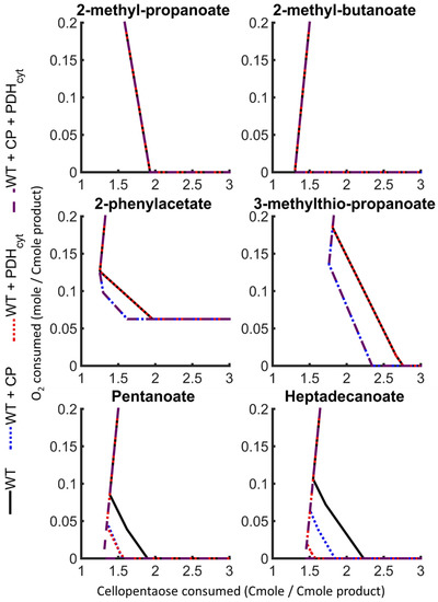 In silico analysis of recombinant CP activity demonstrated a reduced cellular energy requirement for sugar activation. CP conserved some of the energy in a β(1,4) glucose bond via sugar phosphorylation using inorganic phosphate. The energy conservation alleviated the cost of activating n-1 glucose molecules using ATP, where n is the number of monomers in the oligosaccharide being depolymerized. CP activity decreased the predicted requirements for carbon source and O2 for all FHs, except for 2-methyl-propanoate and 2-methyl-butanoate, which did not require a net input of energy to produce (Figure 7). This effect was most prominent under anoxic conditions where cellular energy production is more substrate intensive (Table 2). The Cmoles of substrate required to produce FHs decreased by as much as 17% when cellopentaose was the carbon source. No change was predicted for cultures grown with glucose (n = 1) as the monomeric carbon source does not have β(1,4) glucose bonds.