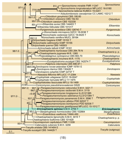 Note: The genus Ericiosphaeria is introduced for fungi with minute, dark ascomata covered by short, opaque, acute setae, two-layered ascomatal wall, scolecosporous, hyaline ascospores and anamorphs with phialidic conidiogenesis. The new genus is typified with E. spinosa, previously classified in Chaetosphaeria [3].